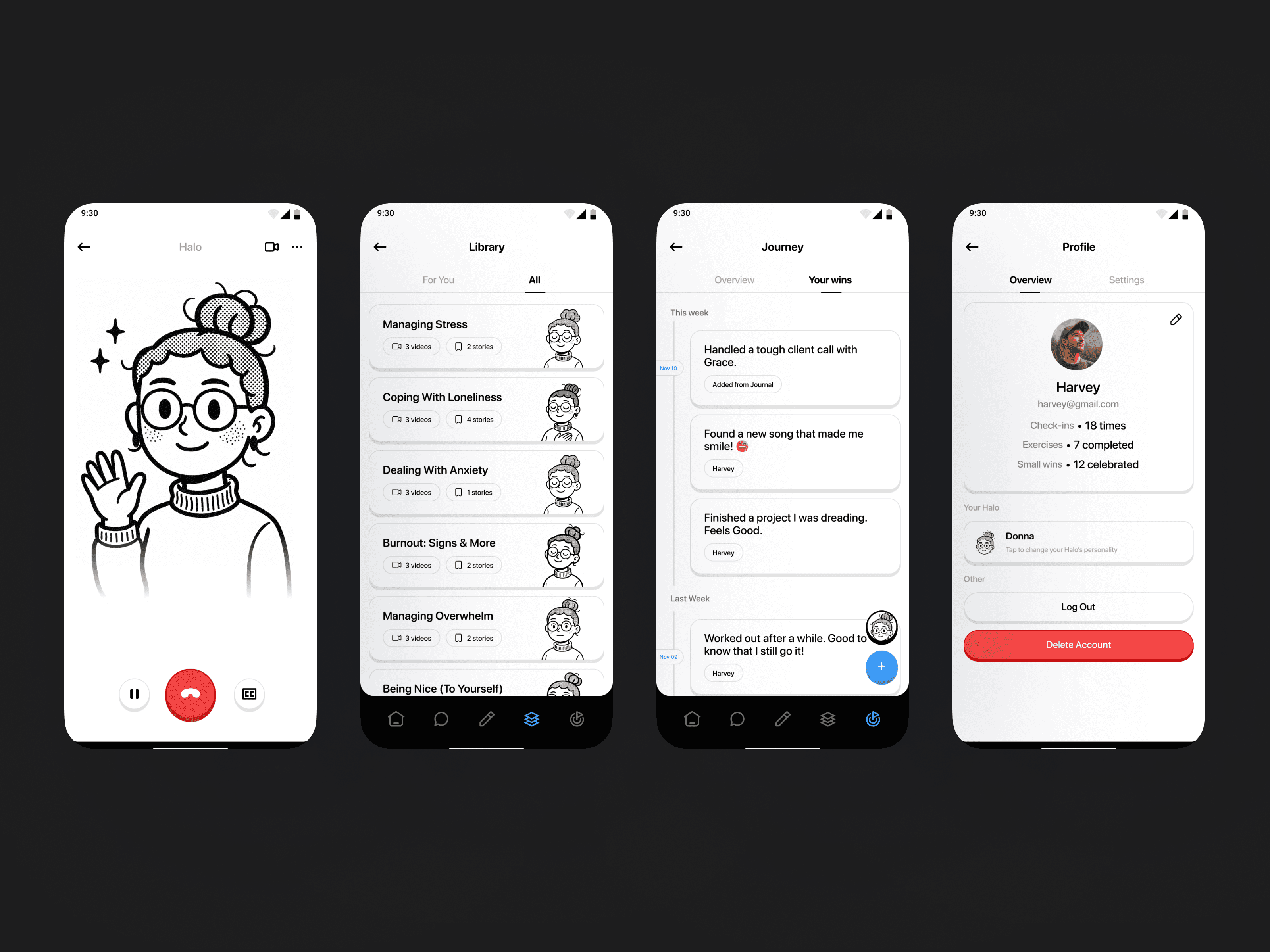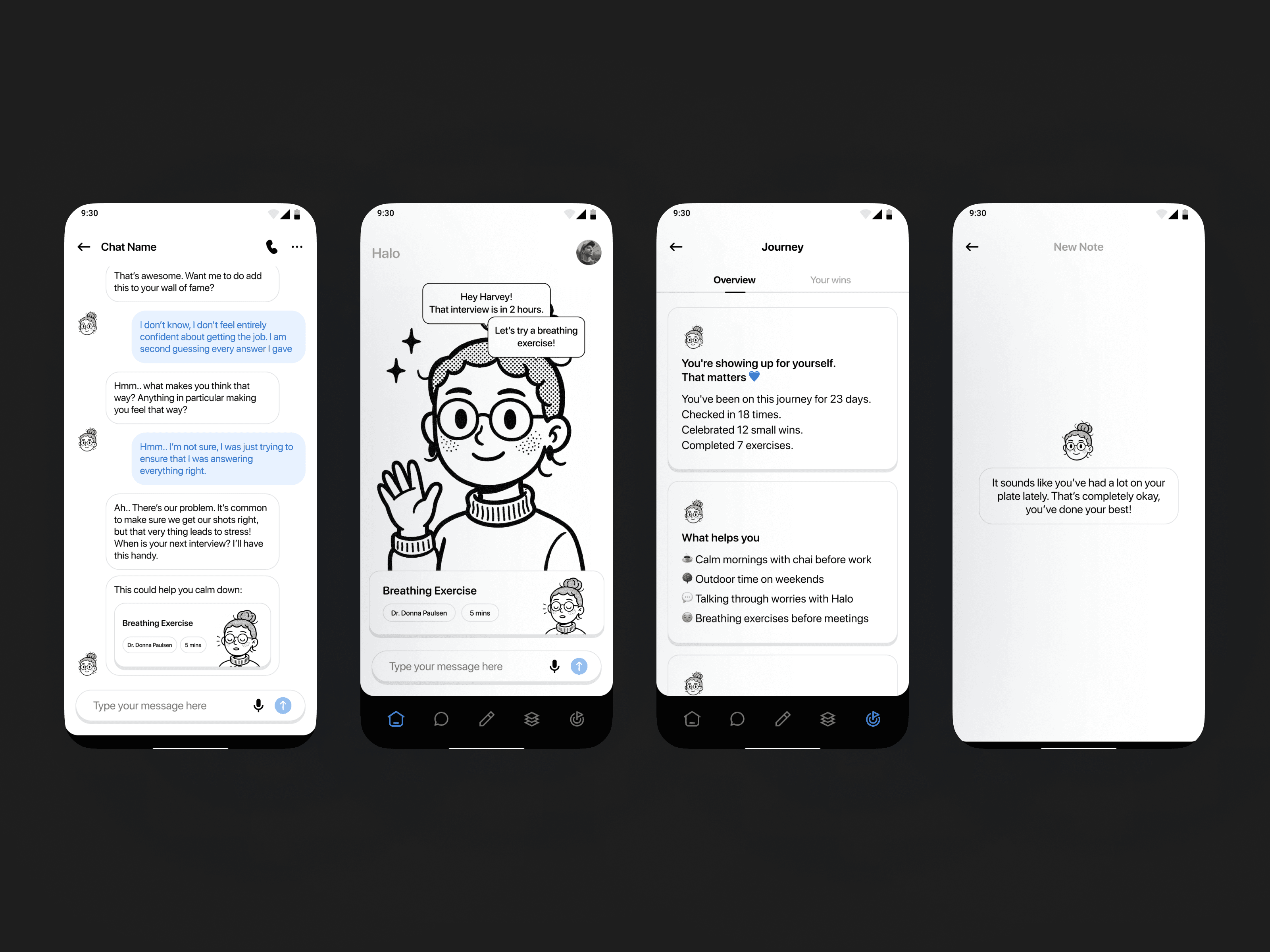 HALO is a mobile experience designed to support young professionals who struggle with emotional fatigue, burnout, and the absence of everyday support. Instead of functioning like another mood tracker or wellness tool, HALO acts as a gentle companion someone who listens, reflects, and stays present without demanding anything in return.